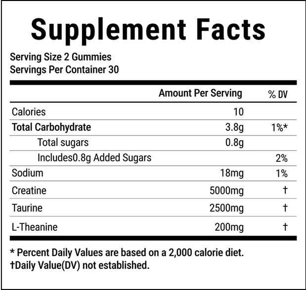 Each gummy contains 2500mg grams of creatine, totaling 5000mg grams per 2-gummy serving.
