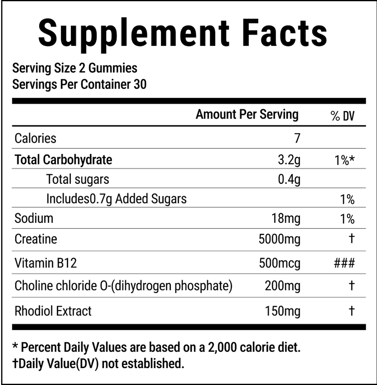 Each gummy contains 2500mg grams of creatine, totaling 5000mg grams per 2-gummy serving.