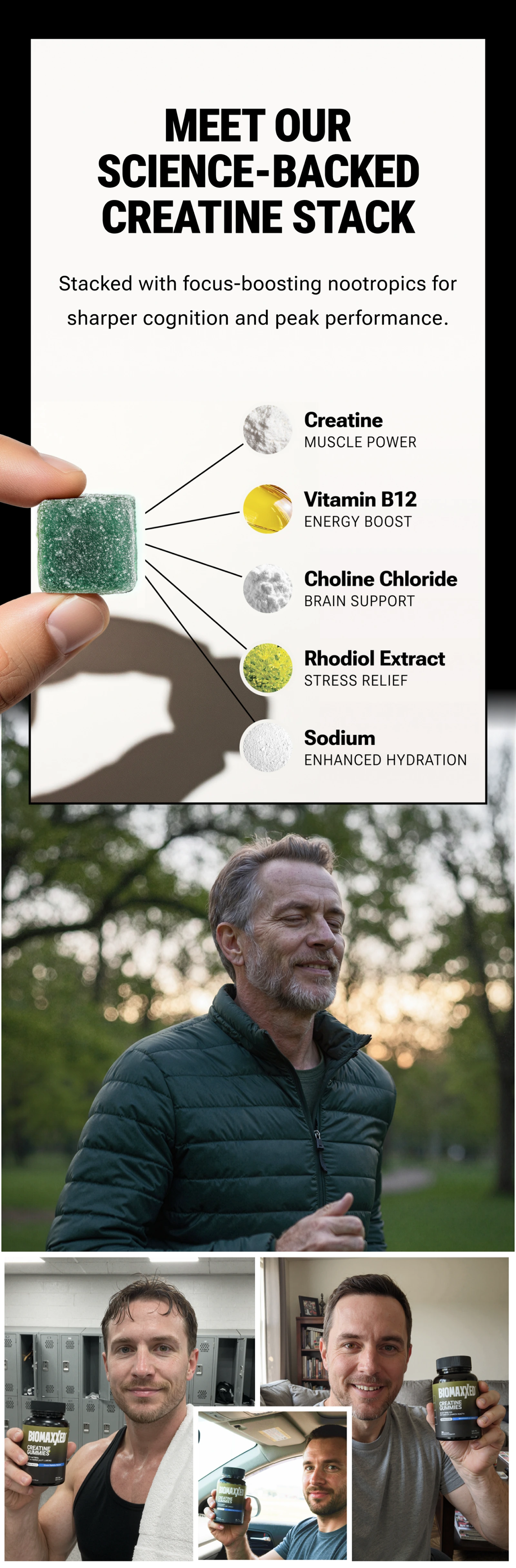 BIOMAXXED™ Creatine Gummies go beyond - combining a full 5000mg clinical dose of creatine with a brain-boosting focus stack to fuel both body and mind.